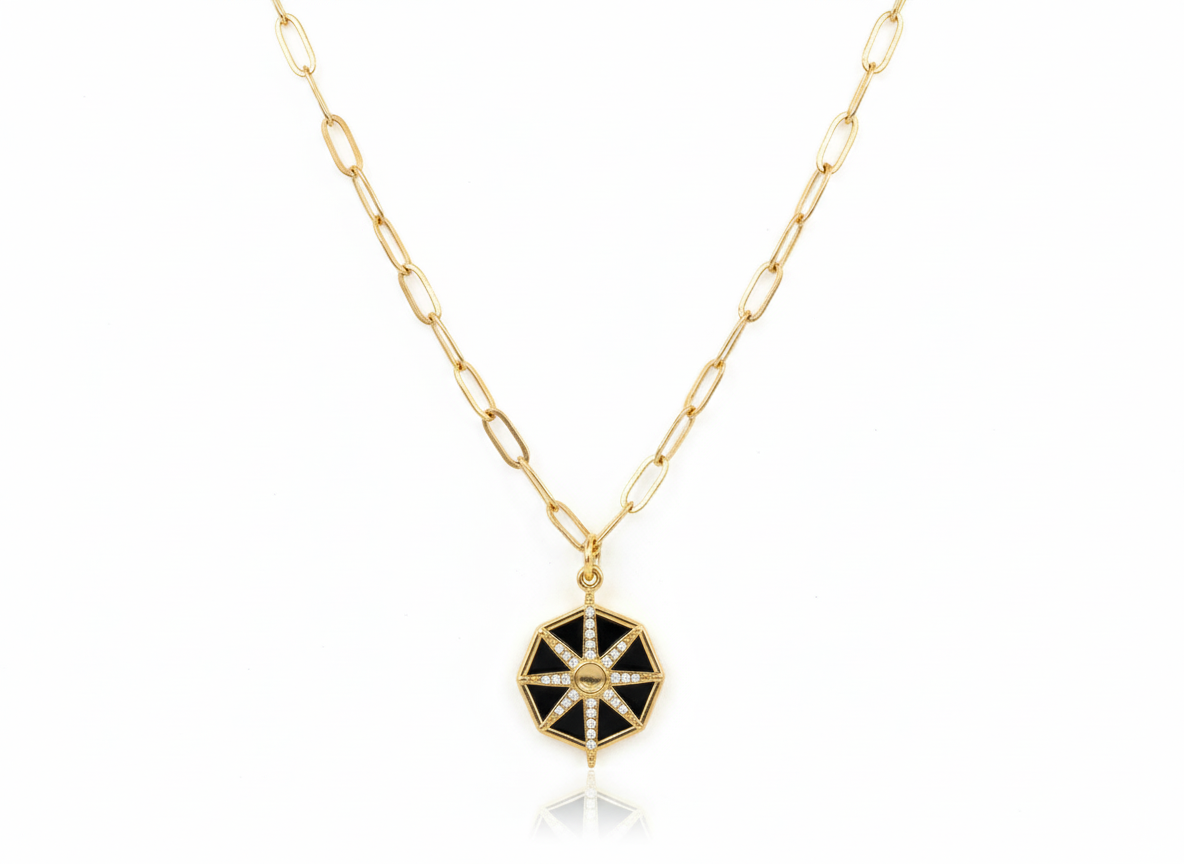 - Pendant Design: Octagonal pendant with a star motif, available in white mother of pearl, abalone pearl, or black, creating a striking focal point.