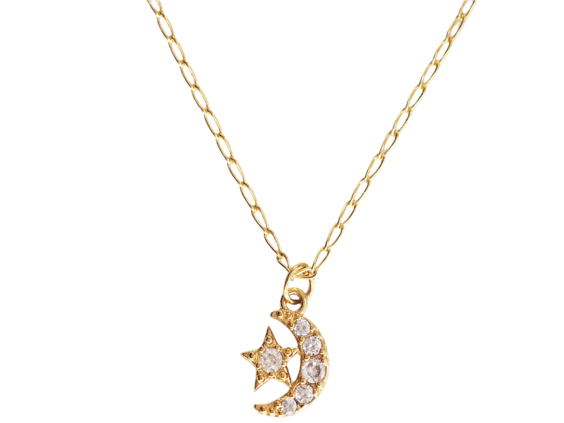 This delicate necklace features a charming moon and star pendant duo, symbolizing dreams, guidance, and inner light. Crafted with a radiant 18K gold-plated finish and an adjustable 17-inch chain, it's perfect for adding a subtle touch of magic to your everyday style.